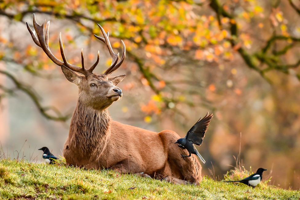 A stag rests as a bird feeds on ticks in its fur, in Bristol, UK.