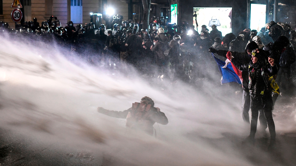 Police spray water at protesters, in Paris. Demonstrators gathered to protest about a controversial security bill, which includes an article seeking to limit the filming of police officers on duty.