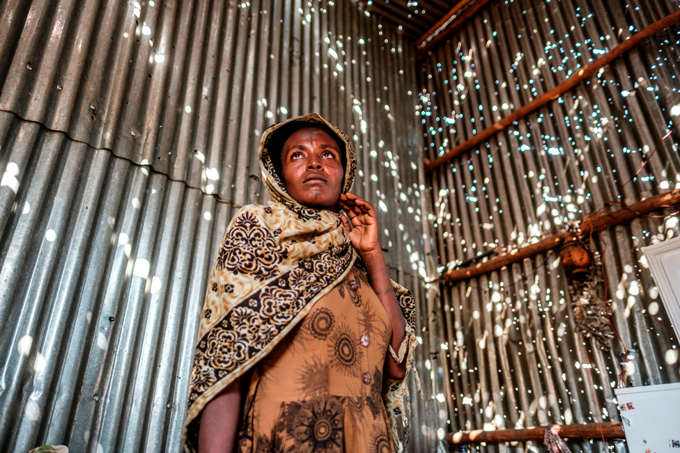 A woman stands in a room that has been damaged by shelling, in Humera, Ethiopia. Hundreds of people have reportedly been killed and thousands forced from their homes during fighting between the national army and forces loyal to the leaders of the northern Tigray region.