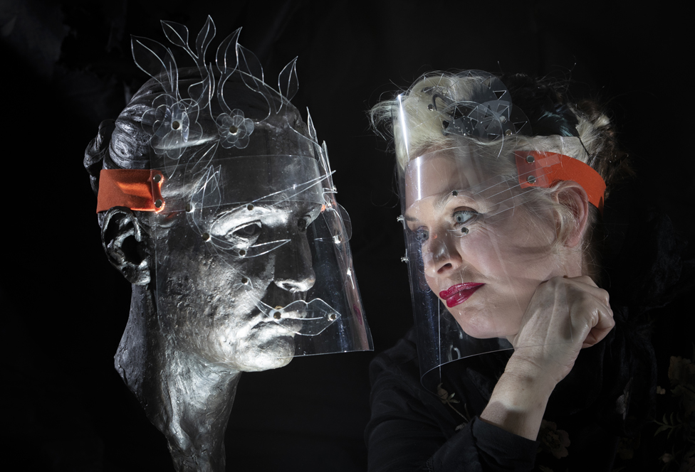 Boo Paterson shows off her decorated face shields. The Scottish artist was inspired to create the masks during lockdown, after seeing Paris fashion house staff wearing standard medical PPE.