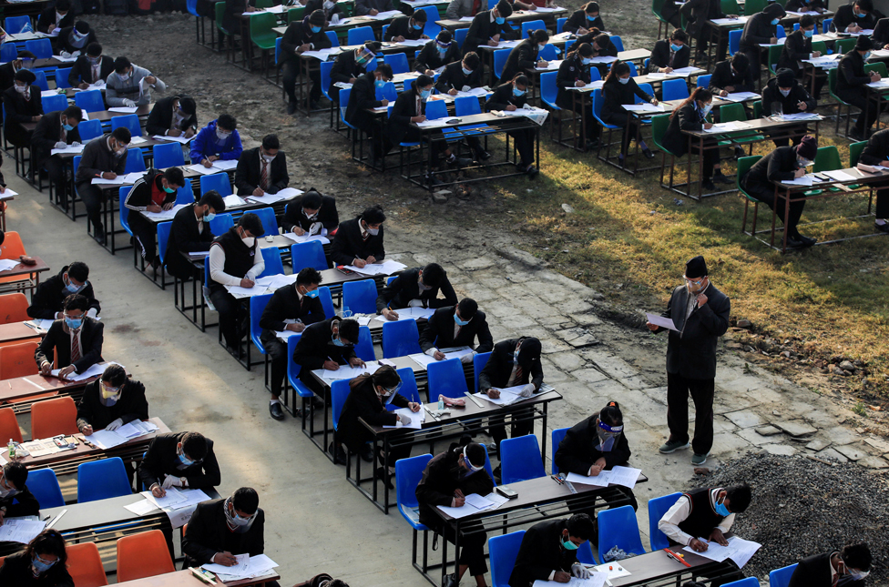 Students wear masks and socially distance as they take their grade 12 exams outside, in Kathmandu, Nepal.