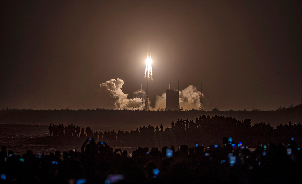 People watch the launch of the Chang'e-5 lunar probe in Wenchang, China. The robotic spacecraft will try to retrieve rock samples from the Moon, before returning to Earth in mid-December.