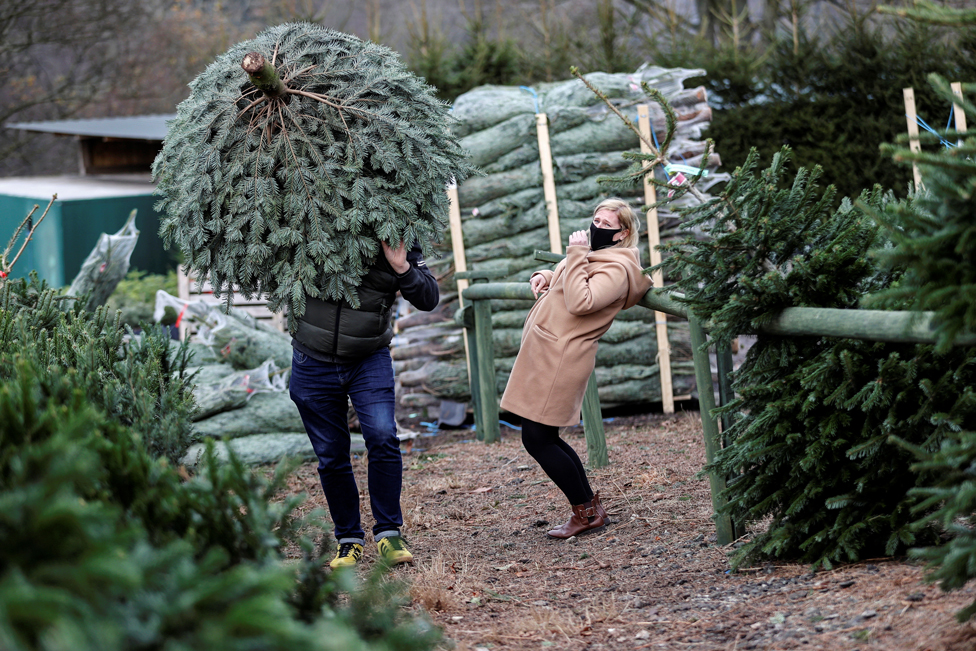한 남자가 스태퍼드셔의 킬에서 크리스마스트리를 나르고 있다. 영국에서는 사람들이 함께 축하할 수 있도록 크리스마스 기간 5일간 코로나바이러스 규제가 완화될 예정이다.